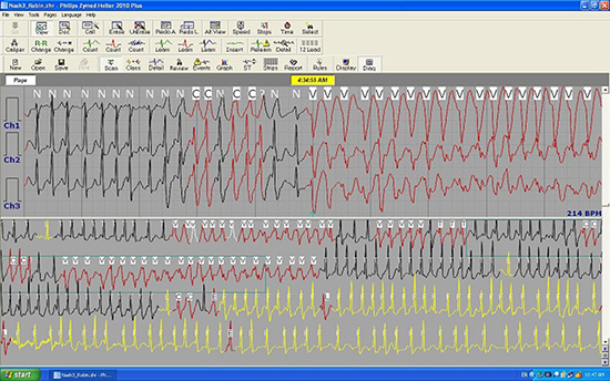 Flecainide, a class 1C anti-arrhythmic agent, depresses the rate of depolarization of cardiac action potentials producing a membrane stabilizing action. It is a very effective anti-arrhythmic agent against supraventricular arrhythmias, nevertheless flecainide is contraindicated in patients with structural heart disease because it increased mortality.22 The proarrhythmic effect of flecainide may be related to promoting a reentry in ventricular tissue. The phenomenon is due to a rate-dependent blockade of rapid sodium channels slowing phase 0 of depolarization and an inhibition of the slow calcium channel.23 In cases of overdose, the mortality with class Ic agents has been reported to approach 22%. Conduction disturbances began with widening of QRS complex which can rapidly progress to ventricular tachycardia, electromechanical dissociation and asystole.