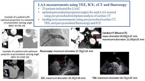 Patients with indications for LAAC were enrolled. Cardiac CT and TEE were done before the procedure; ICE and fluoroscopy measurements were done peri-procedurally. Multiplanar reconstruction of CT images, using FluoroCT software, was done, and optimal “personalized” viewing angles for fluoroscopy were determined. Moreover, a mean (using multiplanar CT reconstruction, derived from the LAA perimetr) amd maximum (using all four imaging modalitities) landing zone (LZ) of the LAA were masured.
