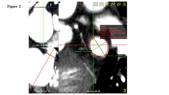 Using cCT, the LZ was measured as the maximum and minimum LZ in en face view of the ostium of the LAA (the plane of measurements had to be perpendicular to the LAA axis). The mean LZ was derived from the LZ perimeter.