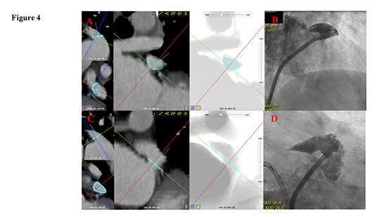 On cCT, personalized viewing fluoroscopy angles were searched for each particular LAA in different combinations of RAO projections with different cranial and caudal projections. The aim was to test for how many patients the fluoroscopic projections recommended by the manufacturer will be acceptable. The RAO 30°, in combination with CRA 10–20° or CAUD 10–20° provided at least one acceptable projection in most patients (22 pts., 88%), although FluoroCT analysis allowed to find the best personalized viewing angle in this relatively broad angle range. However, in patients with the LAA lying superiorly and posteriorly, i.e. LAA with an early posterior angulation lying “backward” on the roof of the left atrium and instead lying superiorly-anteriorly and pointing toward the left ventricle, the optimal fluoroscopic projections differed substantially with greater RAO and CAUD angles being needed. An example of a posteriorly oriented LAA is shown in [Figure 4]; in this particular patient, the optimal viewing angle, analyzed using FlouroCT, was RAO36° - CAUD 26° that was also finally used for implantation [Figure 4].