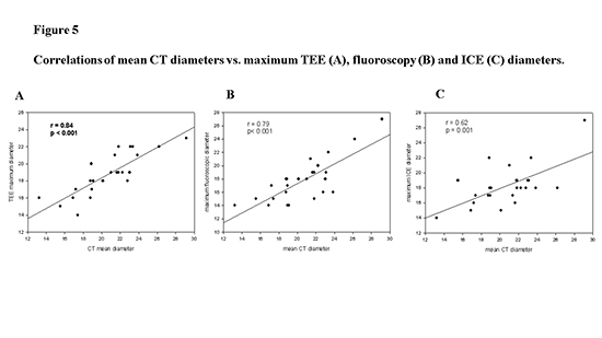Figure 5. Correlations of mean CT diameters with maximum TEE (A), maximum fluoroscopy (B), and maximum ICE (C) diameters