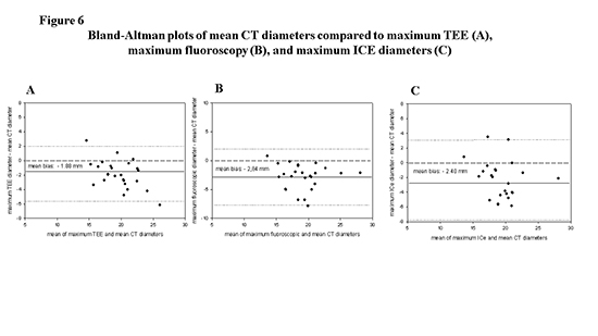 Bland-Altman plots comparing mean CT diameter with maximum diameters obrained from TEE, ICE and fluoroscopy are shown in [Figure 6]. If we used the mean diameter from CT as the best and most accurate standard, then the least discrepancy was found between the mean CT and the maximum TEE diameter (−1.88 mm), next was the mean CT and the maximum ICE diameter (−2.40 mm), and the greatest discrepancy was found between the mean CT and the maximum fluoroscopy diameter (−2.84 mm). The discrepancies between TEE, ICE, and fluoroscopic measurements, compared to cCT values, are shown in [Table 2]. Importantly, the values obtained from TEE and fluoroscopy were constantly ~ 2 lower compared to cCT; however ICE values differed, some of them were lower and some other higher than cCT values.