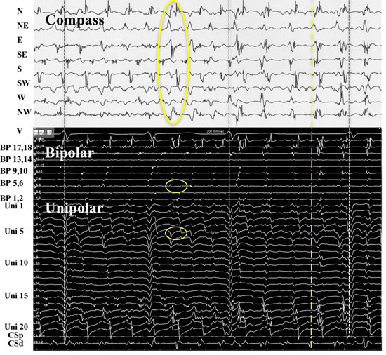 Our purpose was twofold; first, to show that the use of compass mapping, one can regionally identify rotational activity; and second, to show that by combining simultaneous compass map recordings, standard narrow-adjacent bipolar, and unipolar recordings, that specific signature recording patterns emerge that allow one to identify the accurate time, location, and path of a rotational mechanism.