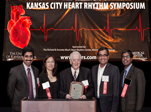 Albert Waldo receiving the Kansas University Pioneer in Cardiovascular Electrophysiology Award. Left to right: Dr. Raghuveer Dendi, Dr. Rhea Pimentel, Dr. Albert Waldo, Dr. Dhanunjaya Lakkireddy and Dr. Madhu Reddy
