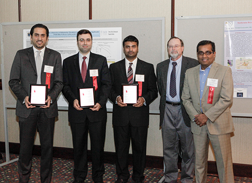Winners of the Manohar Gowda Cardiovascular Research Award Dr. Nima Gasamzadeh (third), Dr. Farshad Forouzandeh (second), Dr. Uma Avula (first) with Dr. James Vacek and Dr. Dhanunjaya Lakkireddy (from left to right).